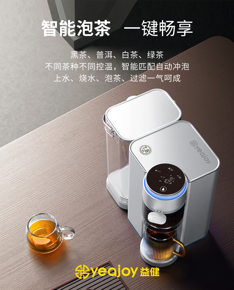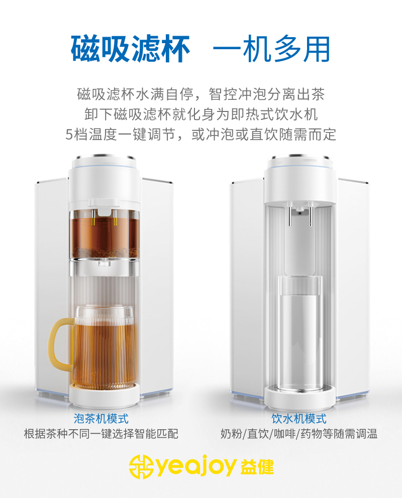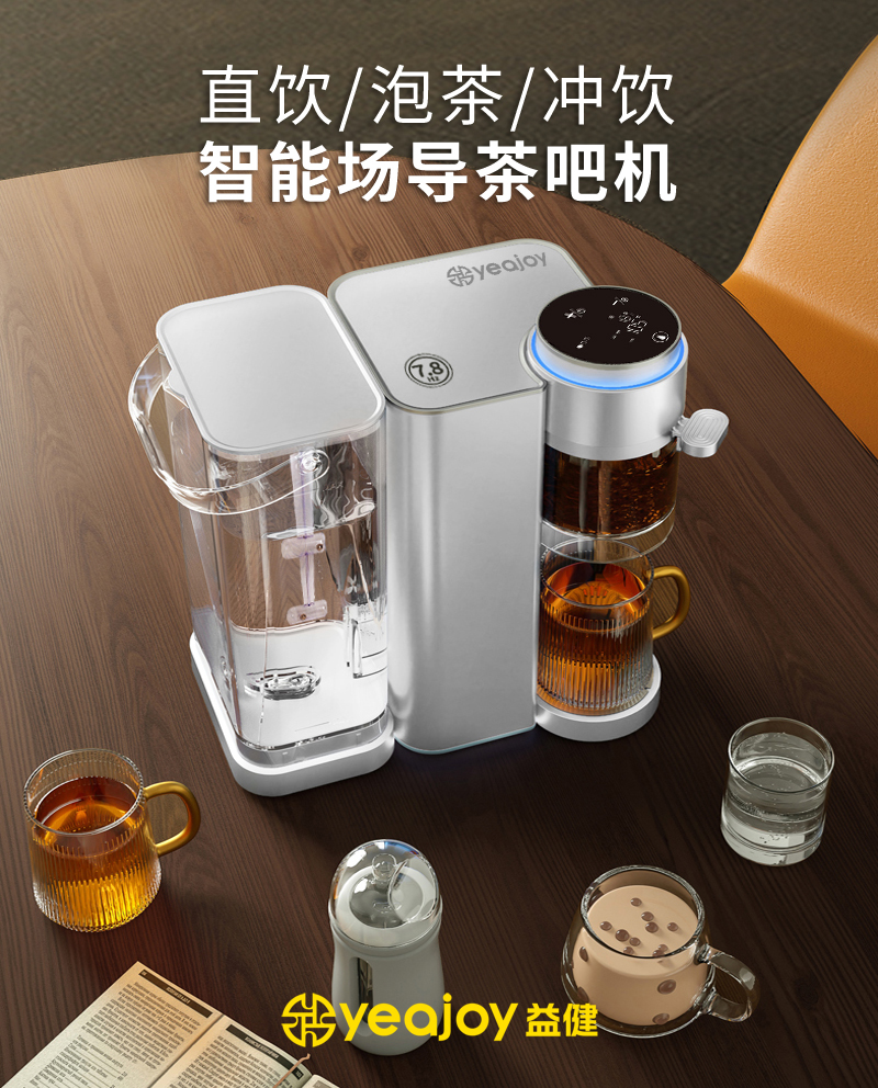 针对无论是家庭还是商务的多元化需求,益健科技智能场导茶吧机产品创新打造 “茶吧机+饮水机” 双模式。在茶吧机模式下,将茶叶放于冲泡过滤一体杯中后,只需一键选择所选茶种,从进水、冲泡、分离到出汤全程智能管控,将传统泡茶的繁杂程序通过智能科技简便化,一样带来不输专业级泡茶的体验。